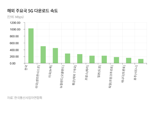 24일 한국통신사업자연합회(KTOA)가 미국과 일본 등 7개 나라 8대 도시를 대상으로 한 '해외 이동통신서비스 품질조사'에 따르면, 2024년 SK텔레콤·KT·LG유플러스 3개 회사의 5G 평균 다운로드 속도는 1,025.52초당 메가비트(Mbps)로 조사 대상 7개국 평균인 268.01Mbps보다 3.8배 높았다. 조사 대상 도시 중 가장 빠른 미국 샌프란시스코의 501.05Mbps와 비교해도 두 배 이상 빠른 수준이다.