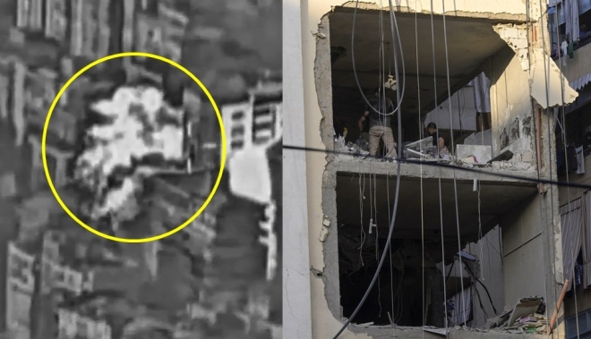 이스라엘군이 하이탐 알리 타바타바이가 머물던 건물을 공습하는 영상(왼쪽)과 파괴된 건물 모습. EPA 연합뉴스 |