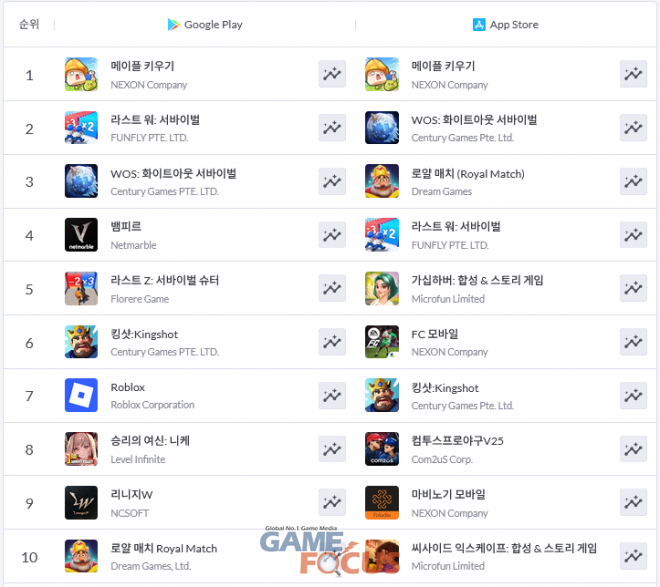 먼저 구글 플레이에서는 '메이플 키우기'가 1위를 지키고 있다. '메이플 키우기'는 출시 이후 줄곧 '라스트 워: 서바이벌', '화이트아웃 서바이벌', '뱀피르', '라스트 Z: 서바이벌 슈터' 등 기존에 TOP 5를 유지하는 게임들을 제치고 선두를 달리고 있다. 이러한 흥행은 '메이플스토리' IP의 높은 인지도와 인기, 가볍게 접근할 수 있는 게임성에 힘입어 라이트 이용자들을 대상으로 한 '박리다매'와 '고래' 이용자들의 과금이 함께 어우러진 결과로 보인다.
