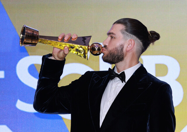한화 이글스 코디 폰세가 24일 열린 2025 KBO 시상식에서 정규시즌 최우수선수(MVP)로 선정된 뒤 트로피에 입을 맞추고 있다. 연합뉴스 |