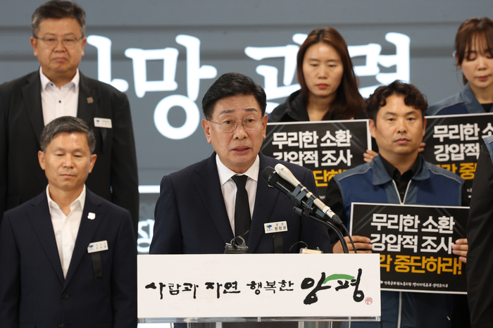 전진선 양평군수가 지난 10월 14일 오후 경기 양평군청 별관 대회의실에서 열린 기자회견에서 김건희 여사의 각종 의혹을 수사 중인 민중기 특별검사팀의 조사를 받은 후 숨진 공무원 관련 기자회견을 하고 있다. [뉴스1] |