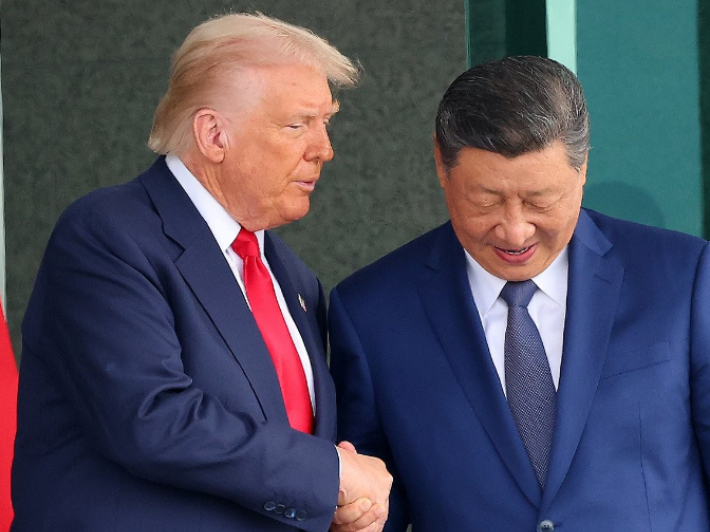 트럼프 미국 대통령과 시진핑 중국 국가주석이 10월 30일 부산 김해공군기지 의전실 나래마루에서 미중 정상회담을 마친 뒤 회담장을 나서며 악수하고 있다. 연합뉴스 |