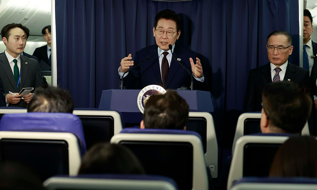 마지막 순방지로 이재명 대통령이 24일(현지시간) 주요 20개국(G20) 정상회의가 열린 남아프리카공화국에서 다음 중동·아프리카 순방지인 튀르키예로 향하는 공군 1호기에서 열린 기자간담회에서 국내외 현안에 대해 얘기하고 있다. 이 대통령은 “남북관계는 참으로 안타깝게도 매우 적대적이고, 대결적 양상으로 바뀌었다”며 “언제 우발적 충돌이 벌어질지 모르는 매우 위험한 상황까지 왔다”고 진단했다. 앙카라=연합뉴스 |