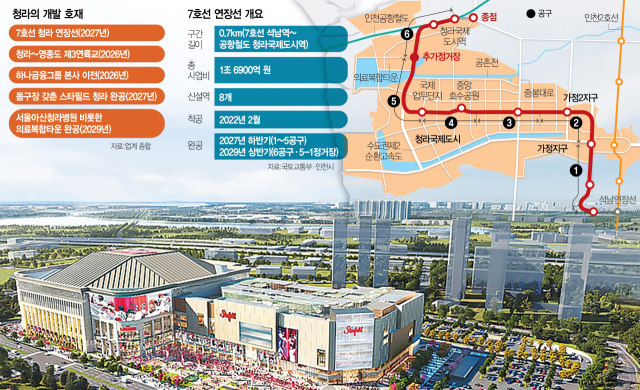 24일 인천시 등에 따르면 시는 7호선 청라 연장선을 1·2단계로 나눠 개통하는 방안을 국토교통부와 협의해 확정할 계획이다. 청라 연장선은 현재 7호선 종점인 석남역에서 공항철도 청라국제도시역을 연결하는 10.7km 구간에 건설 중으로, 신설되는 정거장은 공항철도 환승역인 청라국제도시역을 포함해 8개다.