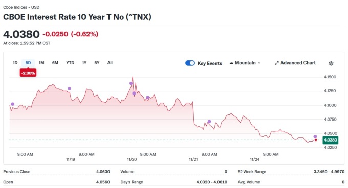 미 국채 10년물 금리 차트, 자료=야후 파이낸스, 2025.11.25 koinwon@newspim.com |