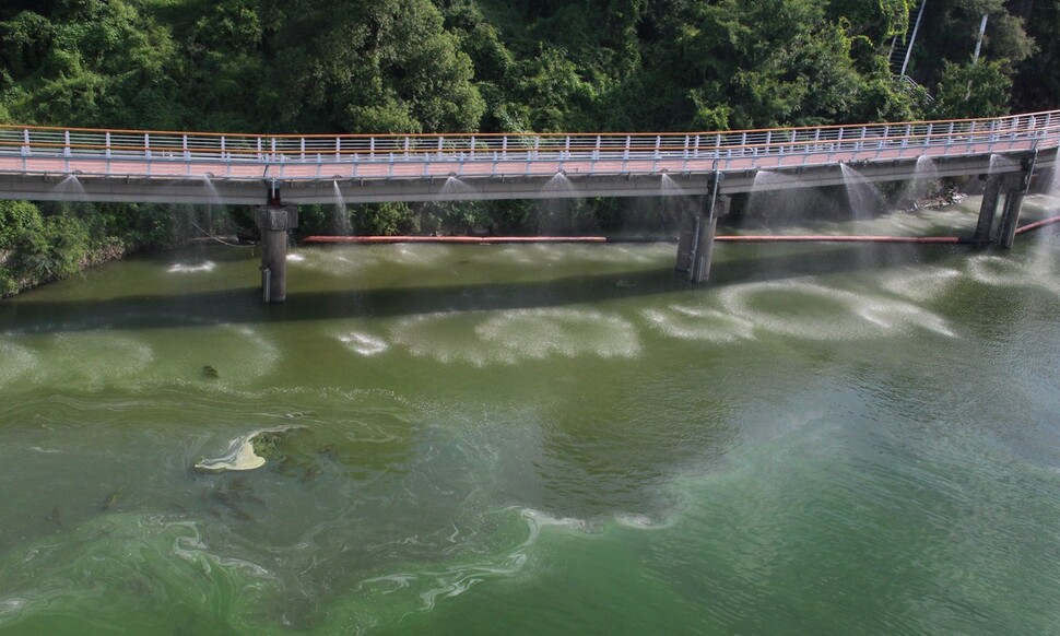 2022년 7월 낙동강 본포 취수장 취수구 앞에서 녹조를 밀어내기 위해 물을 뿌리고 있다. 김규원 선임기자. |