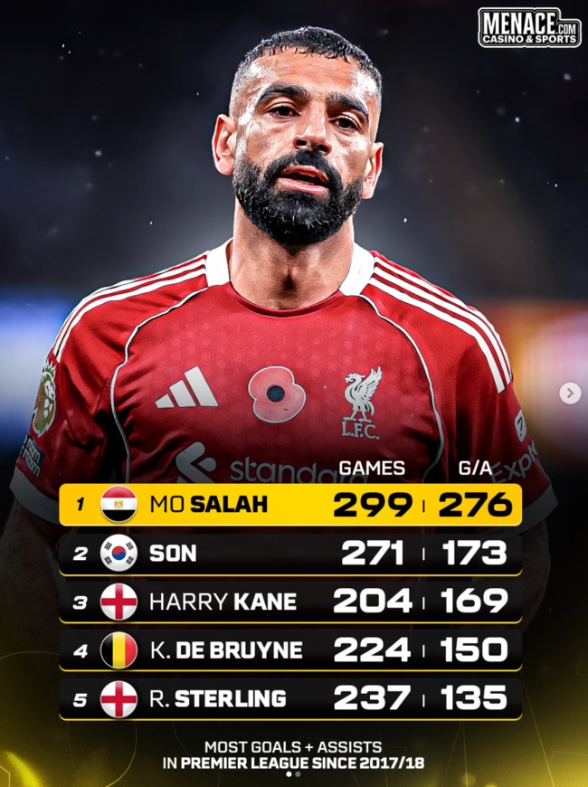 1위는 살라였다. 299경기를 뛰고 276개의 공격포인트를 생산했다. 그 밑으로 손흥민(271경기, 173공격P), 해리 케인(204경기, 169공격P), 케빈 더 브라위너(224경기, 150공격P), 라힘 스털링(237경기, 135공격P) 등이 있었다. 10위권 내에는 제이미 바디, 마커스 래시포드, 브루노 페르난데스 등이 포함됐다.
