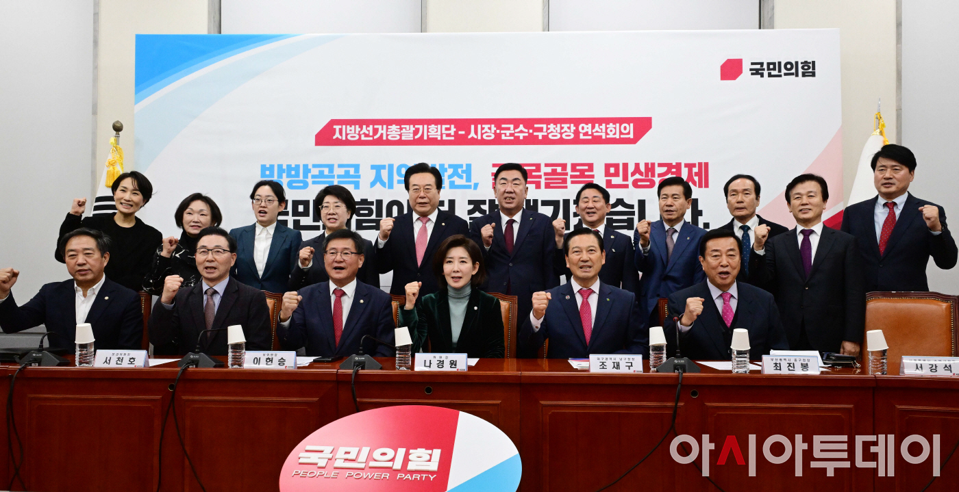 아시아투데이 이병화 기자 = 나경원 국민의힘 지방선거총괄기획단 위원장을 비롯한 참석자들이 25일 국회에서 열린 지방선거총괄기획단 및 당 소속 시장·군수·구청장 연석회의에서 기념촬영을 하고 있다.