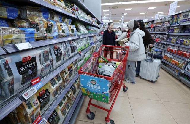 24일 서울 시내의 한 대형마트에서 외국인 관광객들이 김을 구매하고 있다. 뉴시스 |