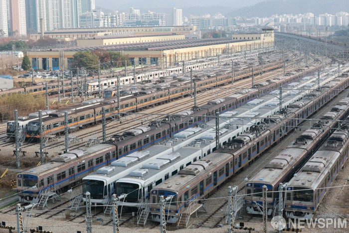 [고양=뉴스핌] 김학선 기자 = 서울지하철 1~8호선을 운영하는 서울교통공사 제1노조인 민주노총 산하 서울교통공사노동조합의 파업 찬반투표가 83.53%로 가결됐다. 1노조는 쟁의대책위 회의를 거쳐 오는 25일 기자회견을 열고 총파업 일정과 총력투쟁 방침을 알릴 예정이다. 앞서 공사 제2노조인 한국노총 소속 서울교통공사통합노조도 지난 14일부터 17일까지 쟁의행위 찬반 투표를 실시했고, 77.97% 찬성으로 가결됐다. 사진은 20일 오후 경기도 고양시 서울교통공사 지축차량기지의 열차 모습. 2025.11.20 yooksa@newspim.com |