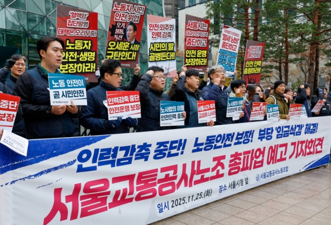 공사 제1노조인 서울교통공사노동조합은 25일 서울 중구 서울시청 앞에서 기자회견을 열고 "서울시와 사측이 노조 요구를 끝까지 묵살하고 비용 절감과 경영효율화 논리를 꺼내 든다면 전면 파업은 불가피하다"며 이같이 주장했다.