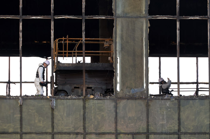 지난 2월 16일 부산 기장군 오시리아 관광단지 오랑대공원 인근의 ‘반얀트리 해운대 부산’ 공사 현장에서 진행된 합동감식에서 감식팀 관계자가 당시 불이 처음 시작된 것으로 추정되는 B동 1층을 집중적으로 살펴보고 있다. 앞서 2월 14일 발생한 화재로 작업자 6명이 숨지고, 27명이 연기 흡입 등 경상을 입었다.(사진=연합뉴스) |