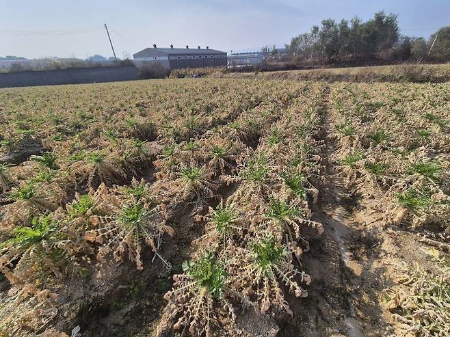 음성군 대소면의 한 무 밭이 화학물질 유출 사고로 갈변 피해를 보았다. 독자 제공. |