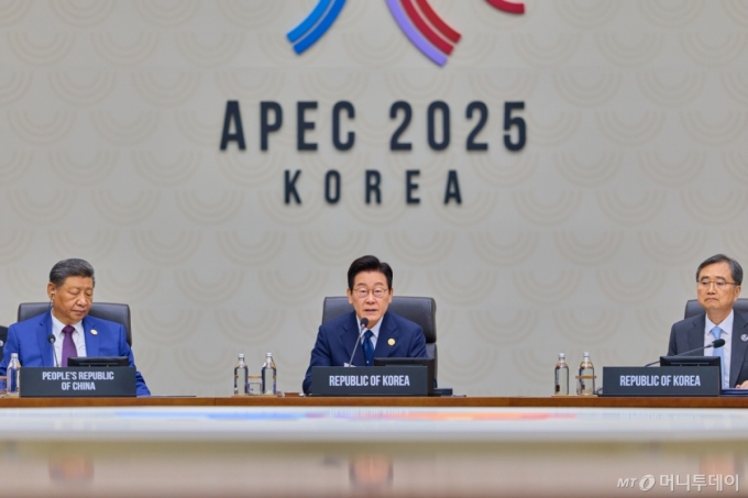 [경주=뉴시스] 고범준 기자 = 이재명 대통령이 1일 경북 경주 경주화백컨벤션센터(HICO)에서 열린 2025 APEC(아시아태평양경제협력체) 정상회의 제2세션에서 발언하고 있다. (사진=대통령실 제공) 2025.11.01. photo@newsis.com *재판매 및 DB 금지 /사진=고범준 |