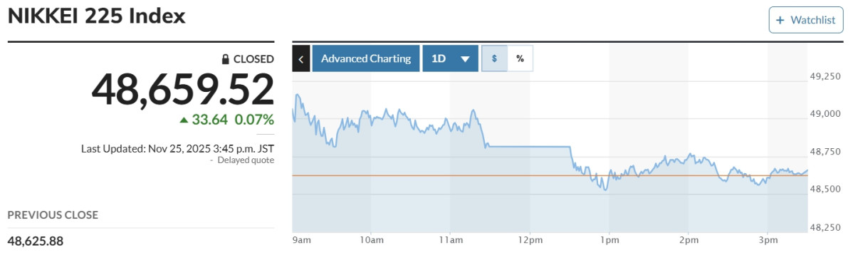 이날 마켓워치에 따르면 일본증시 대표 지수인 닛케이225 평균주가(닛케이)는 전 거래일 대비 33.64엔(0.07%) 오른 4만8659.52엔으로 마감했다. 기술주 중심의 토픽스는 급등 출발했으나 오후 들어 하락 반전했다. 종가는 전날보다 6.84포인트(0.21%) 내린 3290.89에 거래를 마쳤다.