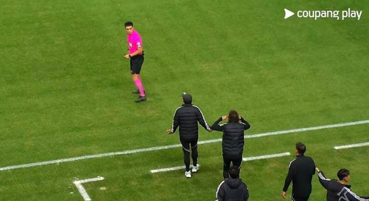전북 현대 타노스 코치가 지난 8일 대전전에서 판정에 항의하는 제스처를 취하고 있다. 사진 쿠팡플레이 |