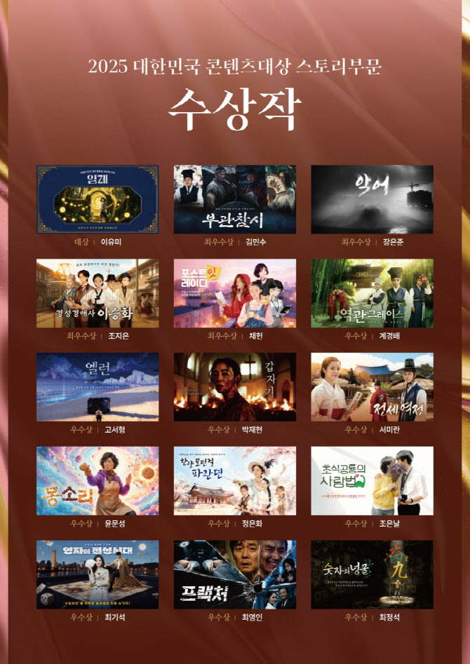 문화체육관광부는 한국콘텐츠진흥원과 함께 25일 서울 강남구 코엑스에서 ‘2025 대한민국 콘텐츠 대상 스토리 부문 시상식’을 열고 수상작 15편을 시상했다고 밝혔다.
