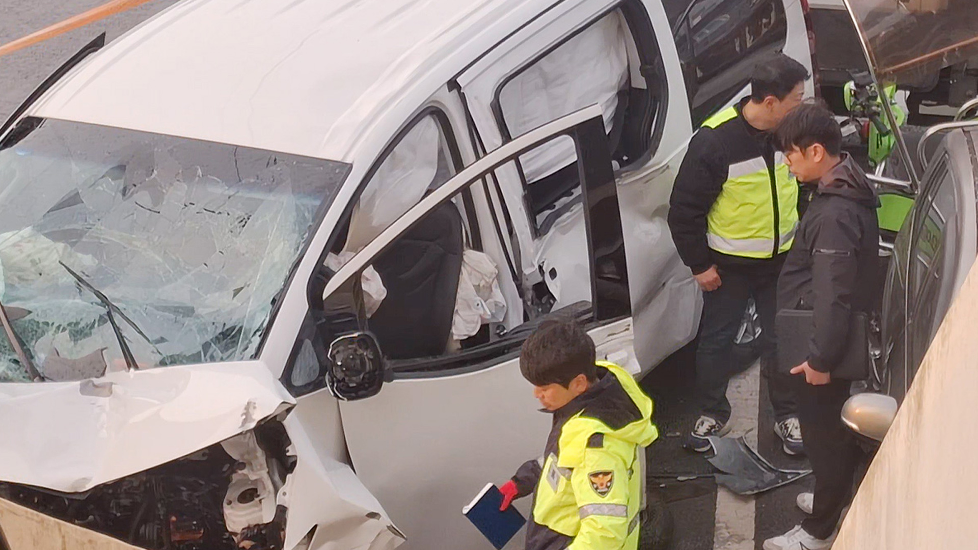 감식 요원들은 카메라로 충돌 부위를 하나하나 채증하며 사고 전후 흔적을 분석합니다.