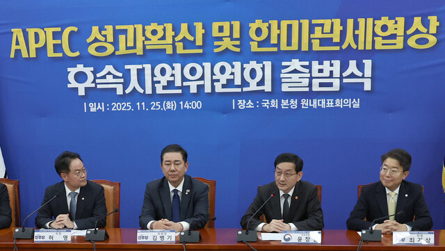 25일 국회 더불어민주당 원내대표실에서 김병기 원내대표와 윤창렬 국무조정실장 등이 참석한 가운데 아시아태평양경제협력체(APEC) 성과 확산 및 한-미 관세협상 후속지원위원회 출범식이 열리고 있다. 윤운식 선임기자 yws@hani.co.kr |
