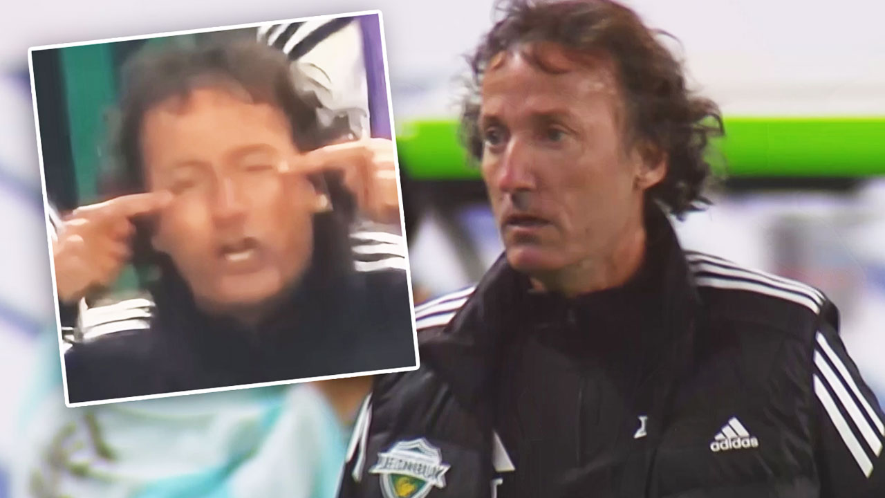 눈가에 양쪽 검지를 갖다 댄 전북 타노스 코치.