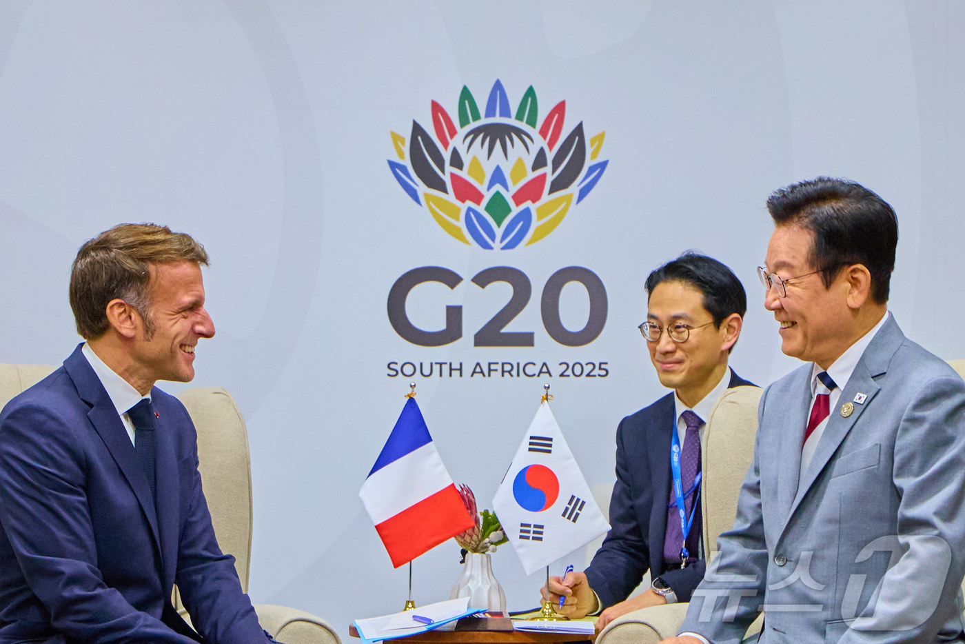 (서울=뉴스1) 이재명 기자 = 이재명 대통령과 에마뉘엘 마크롱 프랑스 대통령이 22일(현지시간) 남아프리카공화국 요하네스버그 엑스포 센터 양자회담장에서 한·프랑스 정상회담을 하고 있다. (이재명 대통령 SNS. 재판매 및 DB 금지) 2025.11.25/뉴스1