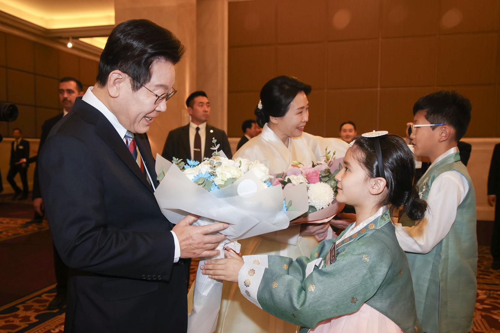이재명 대통령과 김혜경 여사가 25일(현지시간) 튀르키예 앙카라의 한 호텔에서 열린 동포오찬간담회에서 화동으로부터 꽃다발을 받고 있다. 2025.11.25 대통령실사진기자단 |