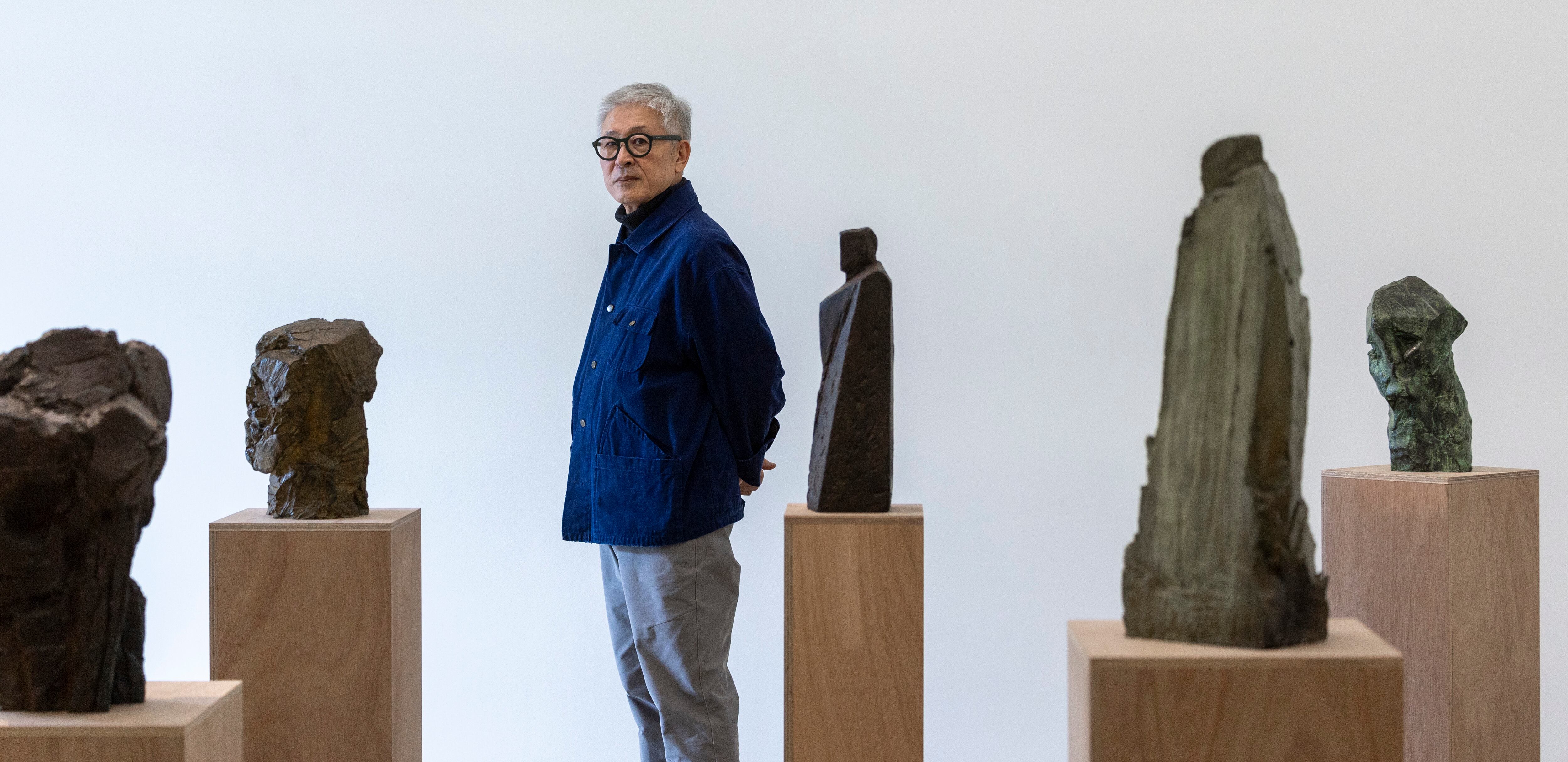 조각가 정현이 서울 삼청동 PKM 갤러리에서 1990년대~2000년대 초반 브론즈 조각 사이에 서 있다. 삽과 각목으로 내리쳐 압착한 투박한 인간 형상에 고뇌하는 얼굴, 서 있는 남자가 보인다. /김지호 기자 |