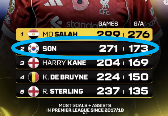 축구 전문 콘텐츠 제작소 '메나스풋볼HQ'가 지난 25일 공개한 통계 자료에 따르면, 손흥민은 2017-2018시즌 이후 프리미어리그에서 271경기 출전, 173공격포인트를 기록하며 모하메드 살라(299경기 276공격포인트) 이어 해당 부문 2위에 올랐다.