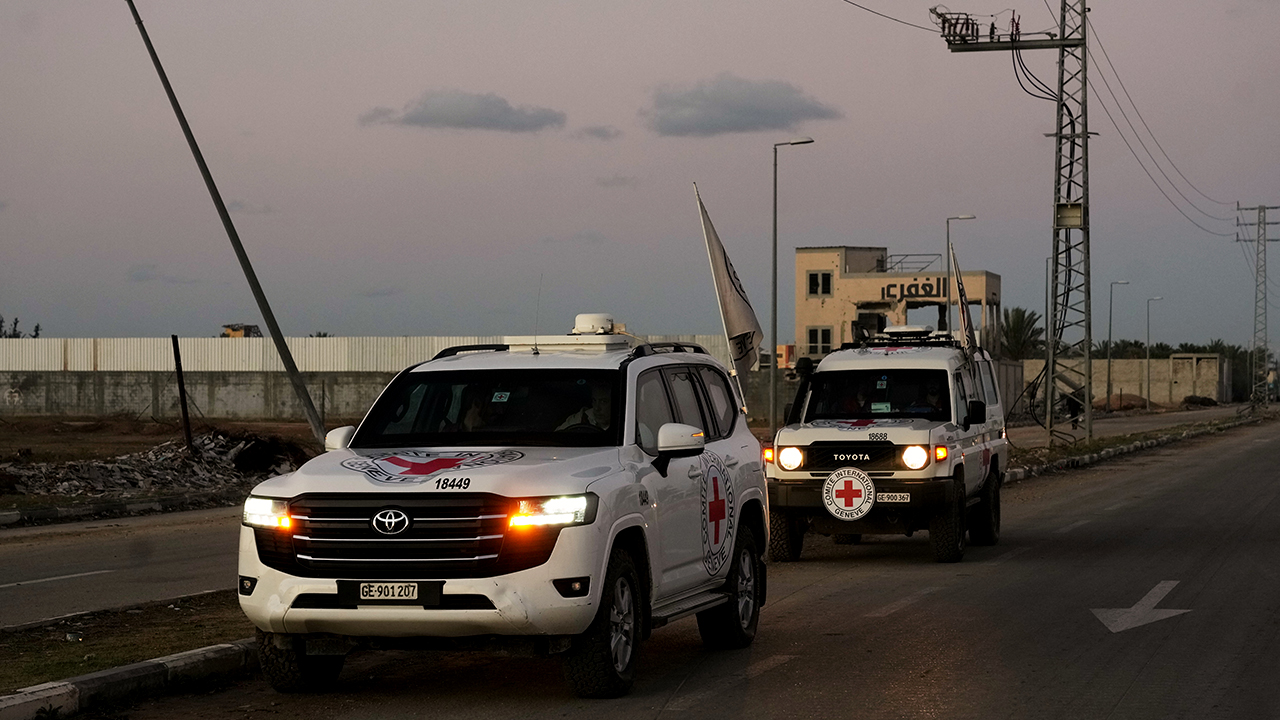 ▲ 25일(현지시간) 국제적십자사 차량이 인질 추정 시신을 이스라엘로 운구 중이다.