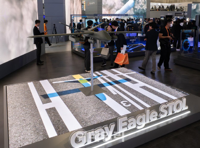 지난 10월 20~25일 경기 고양시 킨텍스에서 열린 ‘ADEX 2025’에서 한화관에 GE-STOL 무인기의 6분의 1 크기 모형이 전시돼 있다. (사진=한화에어로스페이스) |
