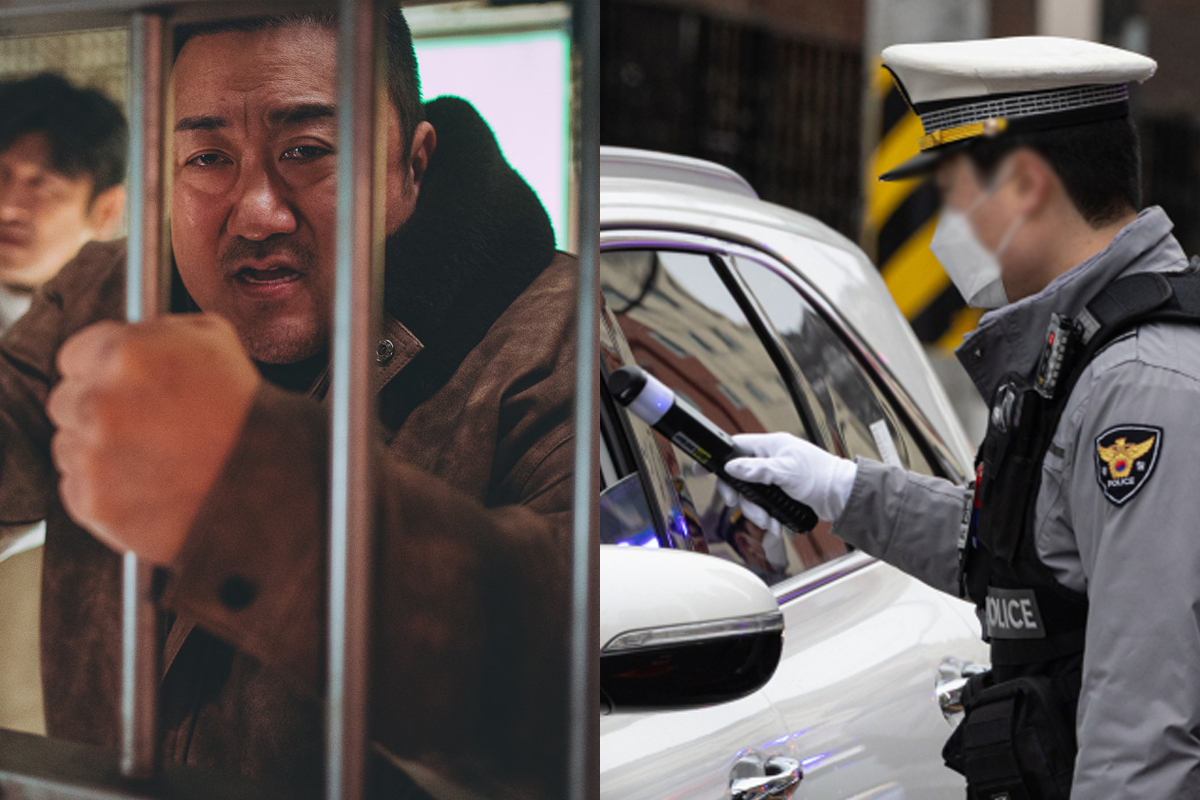 영화 ‘범죄도시4’ 스틸컷. 오른쪽은 서울 서대문구의 한 도로에서 음주 단속 중인 경찰관의 모습. 에이비오엔터테인먼트·뉴스1 |
