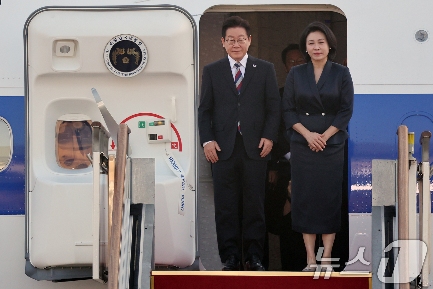 (성남=뉴스1) 황기선 기자 = 아프리카·중동 4개국 순방 일정을 마무리한 이재명 대통령과 김혜경 여사가 26일 오전 경기도 성남시 서울공항을 통해 귀국하고 있다. 2025.11.26/뉴스1
