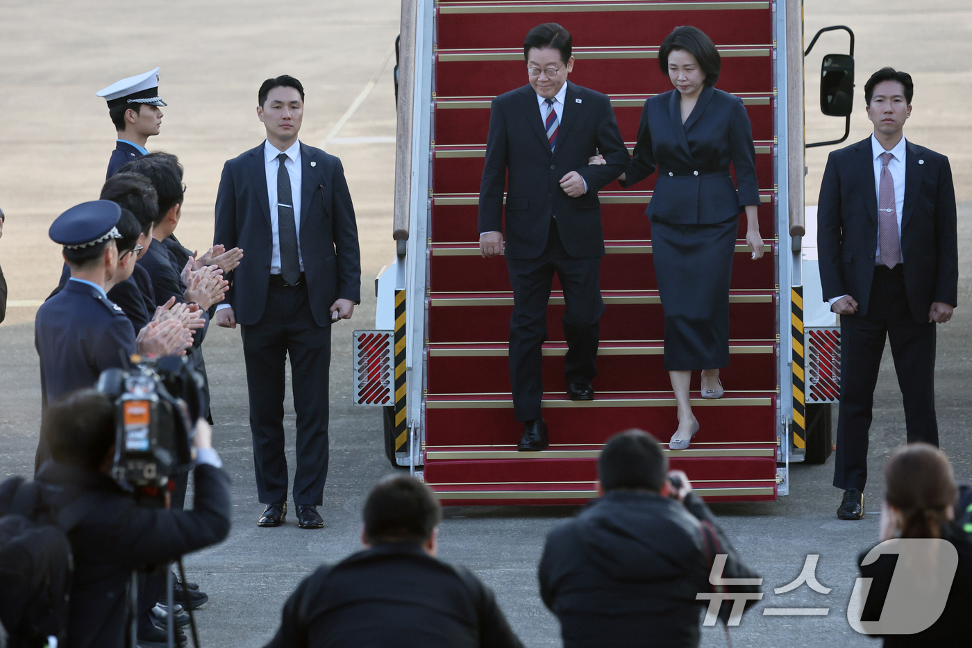(성남=뉴스1) 황기선 기자 = 아프리카·중동 4개국 순방 일정을 마무리한 이재명 대통령과 김혜경 여사가 26일 오전 경기도 성남시 서울공항을 통해 귀국하고 있다. 2025.11.26/뉴스1
