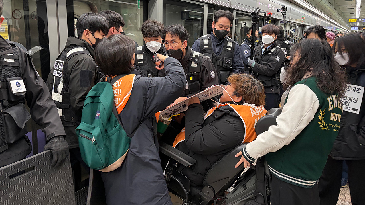 ▲ 지난 18일 서울 지하철 5호선 광화문역에서 탑승 시위 중인 전장연 활동가들