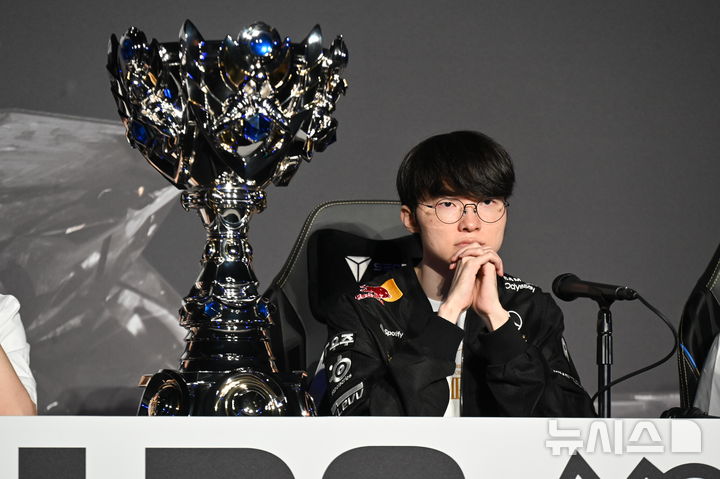 [청두(중국)=뉴시스] 윤정민 기자 = 리그 오브 레전드(LoL) 프로게이머 '페이커' 이상혁(T1)이 9일 오후 중국 청두 동안호 스포츠파크 다목적체육관에서 열린 '2025 LoL 월즈' 결승 후 미디어데이에서 기자 질문에 답하고 있다. 2025.11.09. alpaca@newsis.com |