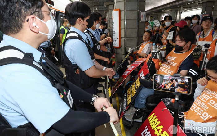 전장연은 정부에 장애인 권리 예산 보장을 촉구하며 지하철 출근길 선전전을 진행 중이다. 전날에는 4호선 혜화역(하선) 열차가 전장연 시위로 무정차 통과하며 직장인들이 불편을 겪었다.
