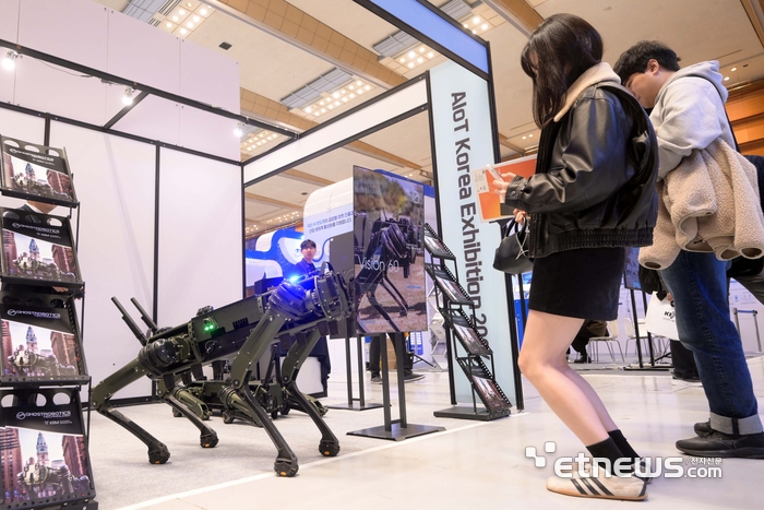 지난해 열린 AIoT 국제전시회 현장에서 관람객이 사족보행로봇을 살펴보고 있다. |