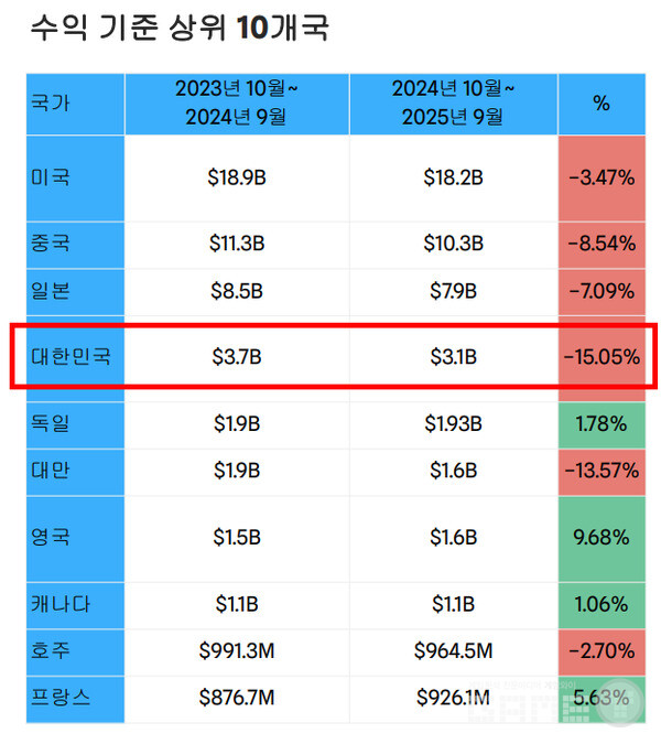 세계 4위 시장 한국의 감소세가 두드러진다. |