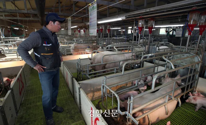 이대한씨가 지난 1월10일 충남 홍성 장곡면의 양돈장에서 어미돼지와 새끼돼지의 상태를 살피고 있다. 서성일 선임기자 |