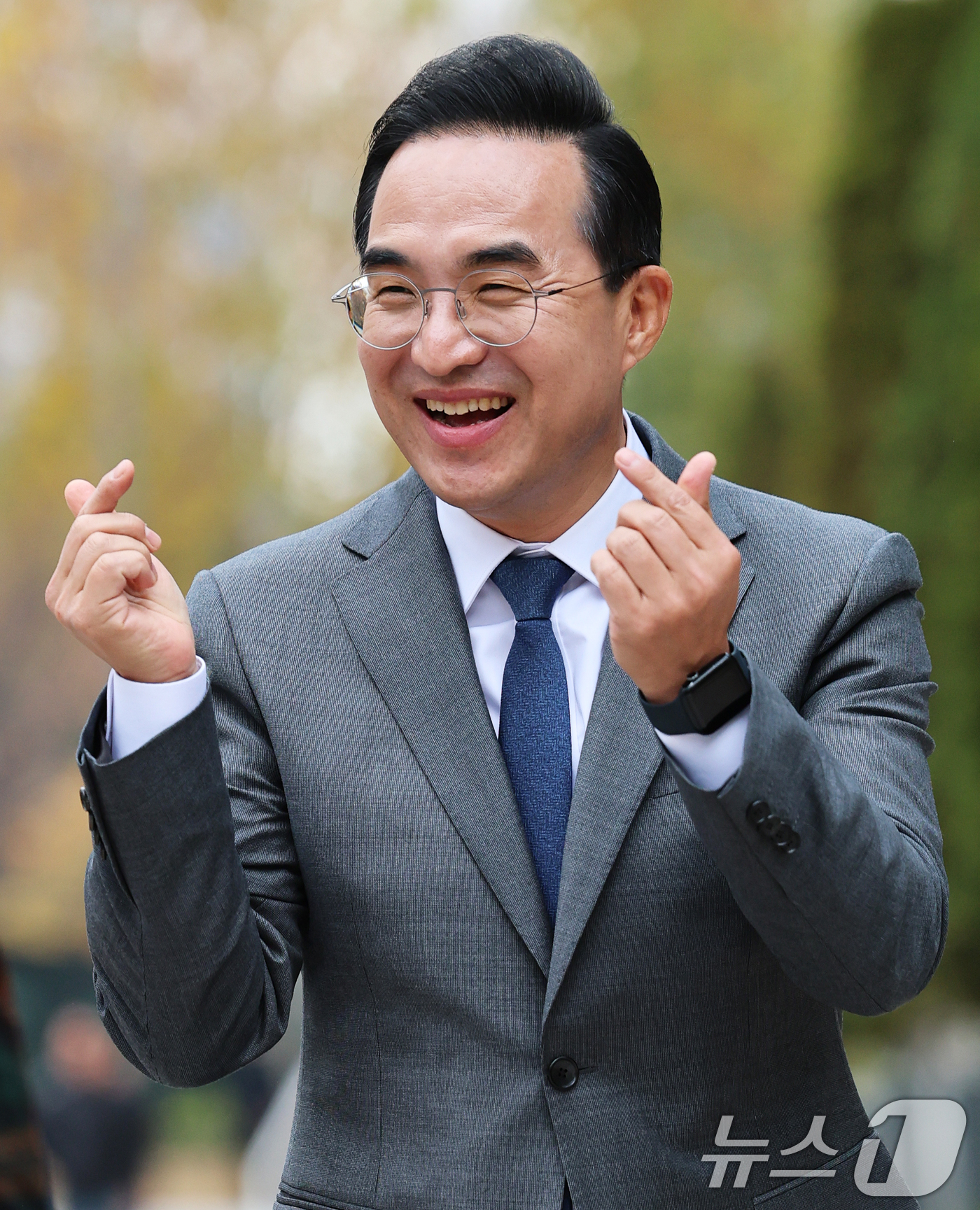(서울=뉴스1) 오대일 기자 = 박홍근 더불어민주당 의원이 26일 서울시청 앞에서 열린 서울시장 출마 선언 기자회견에 참석하며 양손으로 한트를 그려보이고 있다. 당 원내대표를 역임한 4선 중진 박 의원은 이날 민주당에서 가장 먼저 서울시장 출마를 공식 선언하며 서울의 새 역사를 쓰겠다고 다짐했다. 2025.11.26/뉴스1
