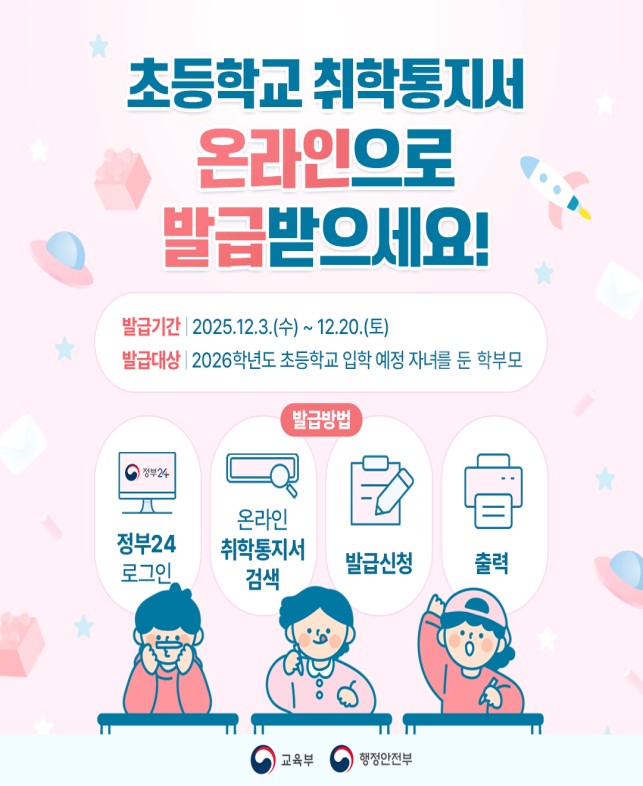 초등학교 취학 대상 아동의 보호자는 12월 3일부터 정부24 누리집에서 온라인으로 취학통지서를 발급받을 수 있다. 오프라인 취학통지서는 12월 10일(지역별 상이)부터 20일까지 관할 읍·면사무소 및 동 주민센터가 우편(등기) 또는 인편으로 발송한다. 정부24 취학통지서는 취학 대상 아동과 동일 세대의 세대주에게만 발급되며, 모바일 앱으로는 제공되지 않는다.