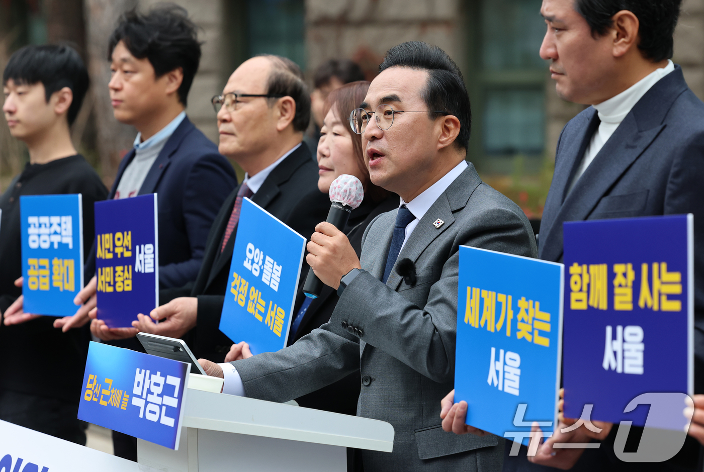 (서울=뉴스1) 오대일 기자 = 박홍근 더불어민주당 의원이 26일 서울시청 앞에서 내년 6월 치러지는 서울시장 선거 출마 선언을 하고 있다. 당 원내대표를 역임한 4선 중진 박 의원은 이날 민주당에서 가장 먼저 서울시장 출마를 공식 선언하며 서울의 새 역사를 쓰겠다고 다짐했다. 2025.11.26/뉴스1