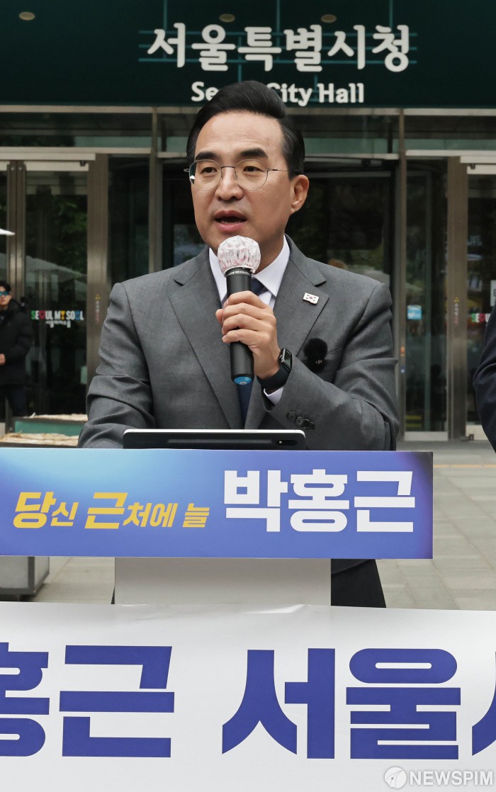 [서울=뉴스핌] 양윤모 기자 = 박홍근 더불어민주당 의원이 26일 오후 서울시청 앞에서 내년 6월 3일 치러지는 서울시장 출마를 선언하고 있다. 더불어민주당 원내대표를 역임한 4선 중진 박홍근 의원은 민주당 내 서울시장 출마를 가장 먼저 공식화 했다.이 자리에서 박 의원은 현 서울시정의 문제를 3불(불안정·불균형·불평등)로 규정하고, '서울의 성장 동력 제고 방안' 등을 제시했다. 2025.11.26 yym58@newspim.com