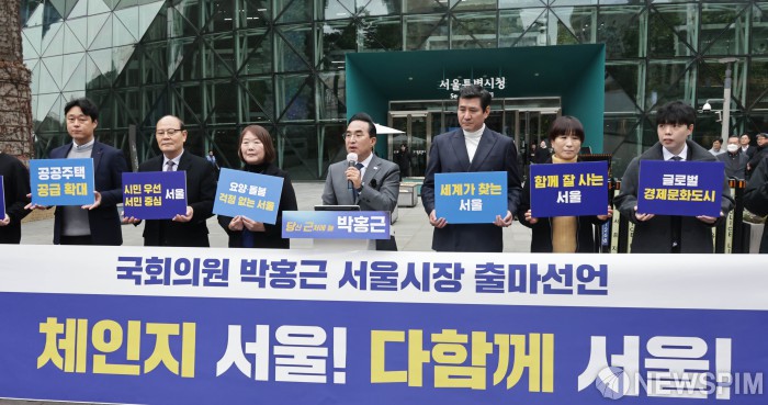 [서울=뉴스핌] 양윤모 기자 = 박홍근 더불어민주당 의원이 26일 오후 서울시청 앞에서 내년 6월 3일 치러지는 서울시장 출마를 선언하고 있다. 더불어민주당 원내대표를 역임한 4선 중진 박홍근 의원은 민주당 내 서울시장 출마를 가장 먼저 공식화 했다.이 자리에서 박 의원은 현 서울시정의 문제를 3불(불안정·불균형·불평등)로 규정하고, '서울의 성장 동력 제고 방안' 등을 제시했다. 2025.11.26 yym58@newspim.com