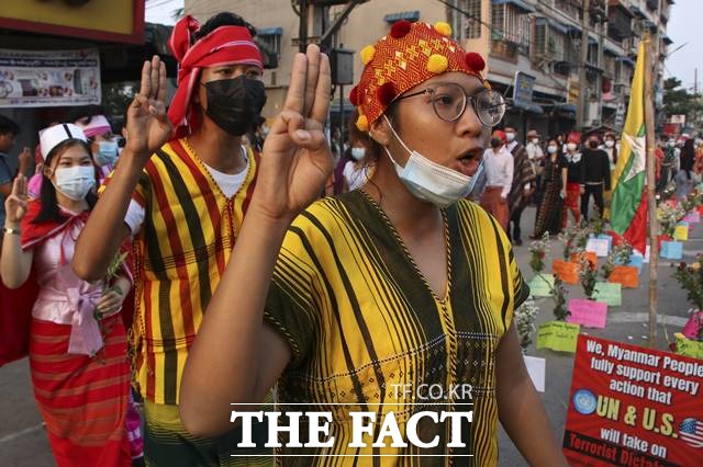 미 국토안보부가 미얀마 국적 체류자의 '추방 보호 신분'을 종료한다고 24일(현지시간) 발표했다. 이에 인권 단체를 중심으로 비판이 제기되고 있다. 사진은 지난 2021년 3월 24일(현지시간) 미얀마 양곤에서 세 손가락 경례를 하며 구호를 외치고 있는 군부 쿠데타 반대 시위대. /AP.뉴시스 |
