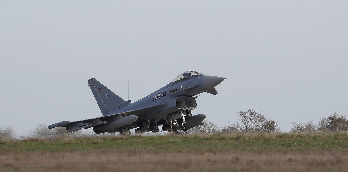 25일(현지시간) 루마니아 콘스탄차 인근 미하일 코갈니체아누 제57공군기지에서 무장한 독일 공군 유로파이터 타이푼 전투기가 드론 감시 임무를 마치고 활주로에 착륙하고 있다. EPA연합뉴스 |