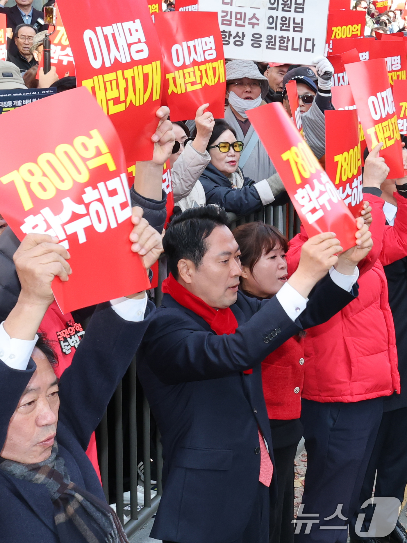 (천안=뉴스1) 김기태 기자 = 장동혁 국민의힘 대표가 26일 충남 천안시외버스터미널 앞에서 열린 민생회복 법치수호 국민대회에 참석해 당직자들과 이재명 대통령 재판 재개 촉구, 7800 환수 촉구 피켓을 들고있다. 2025.11.26/뉴스1