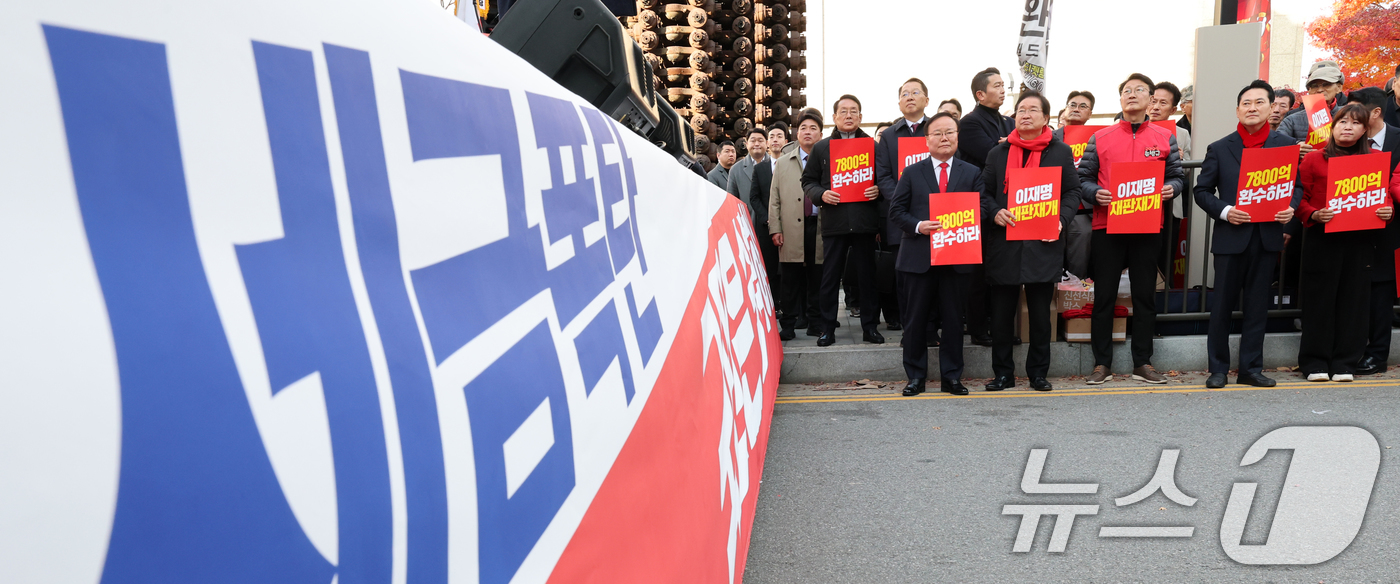 (천안=뉴스1) 김기태 기자 = 장동혁 국민의힘 대표가 26일 충남 천안시외버스터미널 앞에서 열린 민생회복 법치수호 국민대회에 참석해 당직자들과 이재명 대통령 재판 재개 촉구, 7800 환수 촉구 피켓을 들고있다. 2025.11.26/뉴스1