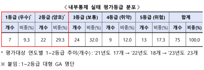 26일 금융감독원은 대형 GA에 대한 2024년도 내부통제 실태 평가 결과를 이같이 발표했다. 실태 평가는 대형 GA 75개 업체를 대상으로 이뤄졌다. 금감원은 소속 설계사가 500명 이상인 대형 GA의 내부통제 강화를 유도하기 위해 2022년부터 관련 평가를 진행하고 있다. 평가 등급은 1등급(우수)부터 5등급(위험)까지 나뉜다.