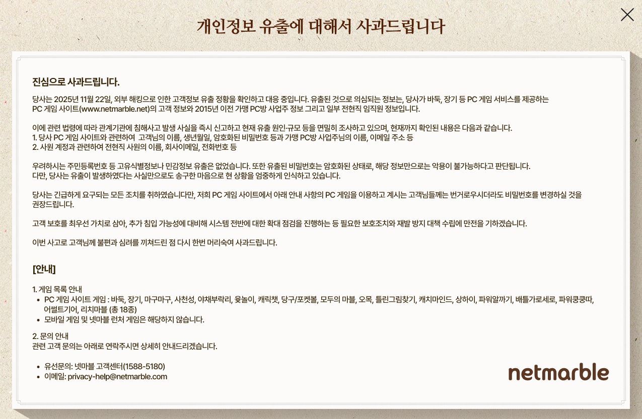 넷마블은 이날 홈페이지를 통해 “당사는 2025년 11월 22일 외부 해킹으로 인한 고객정보 유출 정황을 확인하고 대응 중”이라며 “유출된 것으로 의심되는 정보는 당사가 바둑, 장기 등 PC 게임 서비스를 제공하는 PC게임 사이트의 고객정보와 2015년 이전 가맹 PC방 사업주 정보, 일부 전현직 임직원의 정보”라고 밝혔다. 넷마블은 유출 사실을 인지한 즉시 관계기관에 침해사고 발생 사실을 신고했고, 현재 유출 원인과 규모 등을 조사 중이라고 덧붙였다.